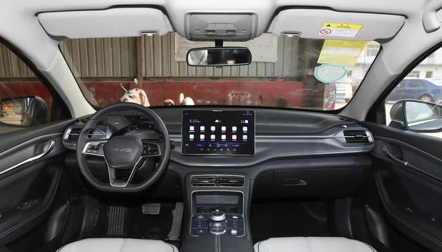 内饰的话,驱逐舰05整体设计没有什么惊艳的地方,属于常规家用的风格。中控台是Y字型对称布局,中间是一块12.8英寸的悬浮屏,三幅式方向盘造型简约大气,上面还有镀铬修饰,虽说档次感一般,不过看得出来用料还是下了功夫的,和合资十几万的车型差不多。而且配置不也低,即便是最低配车型也配备了4个超声波雷达,其他的还有自动空调、PM2.5过滤装置、LED大灯和自动大灯、6个扬声器、OTA升级、运动风格的仿皮座椅、后驻车雷达、倒车影像等。